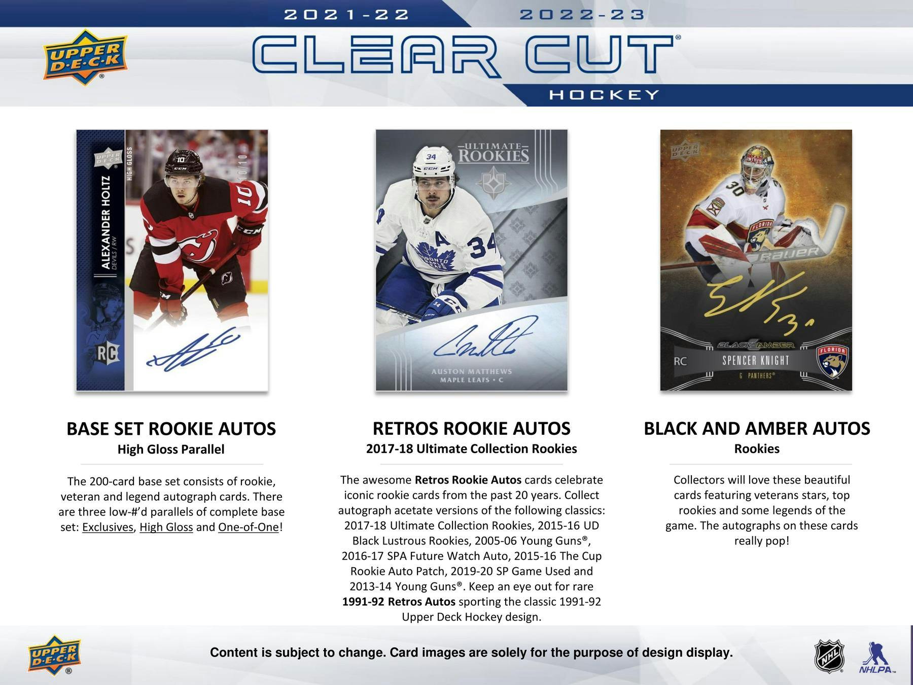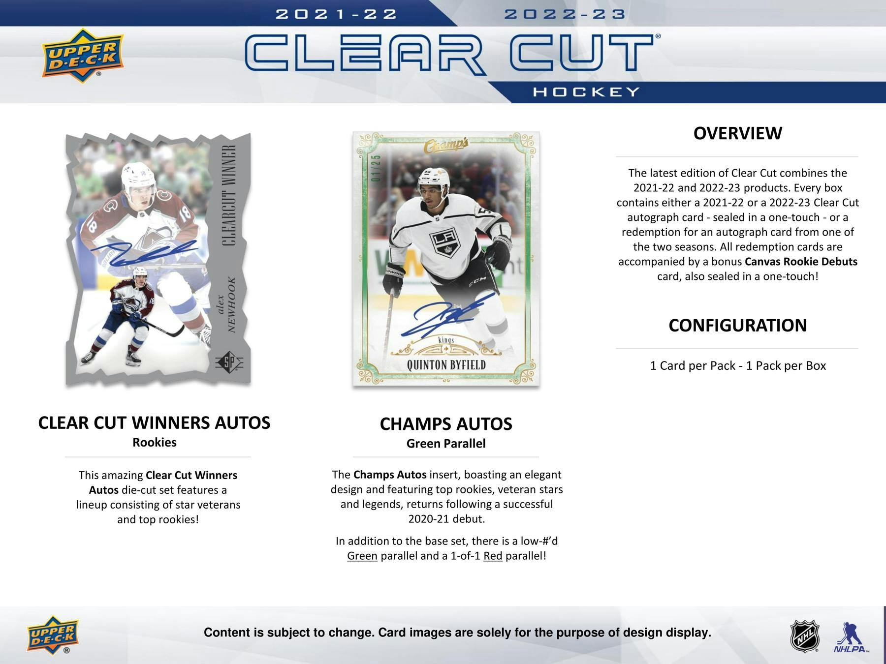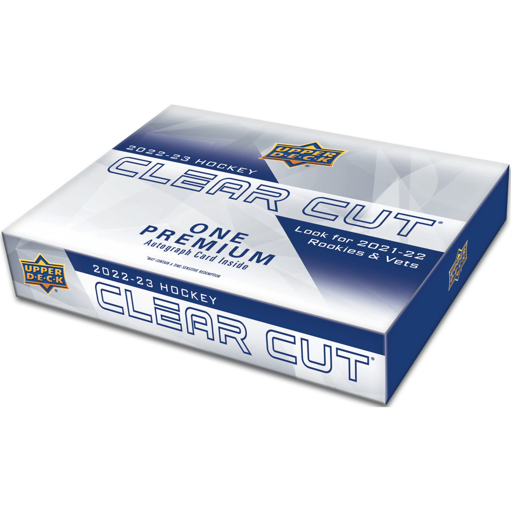 The latest edition of Clear Cut combines the 2021-22 and 2022-23 products. Every box contains either a 2021-22 or a 2022-23 Clear Cut autograph card - sealed in a one-touch - or a redemption for an autograph card from one of the two seasons.All redemption cards are accompanied by a bonus Canvas Rookie Debuts card, also sealed in a one-touch!
