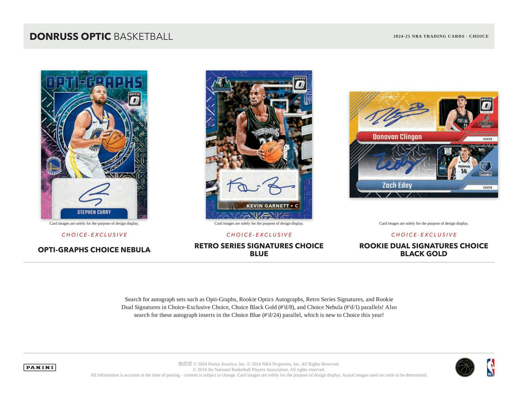 Each Choice Box contains 1 Autograph! Search for autograph sets such as Opti-Graphs, Rookie Optics Autographs, Retro Series Signatures, and Rookie Dual Signatures in Choice-Exclusive Choice, Choice Black Gold (#'d/8), and Choice Nebula (#'d/1) parallels! Also search for these autograph inserts in the Choice Blue (#'d/24) parallel, which is new to Choice this year!