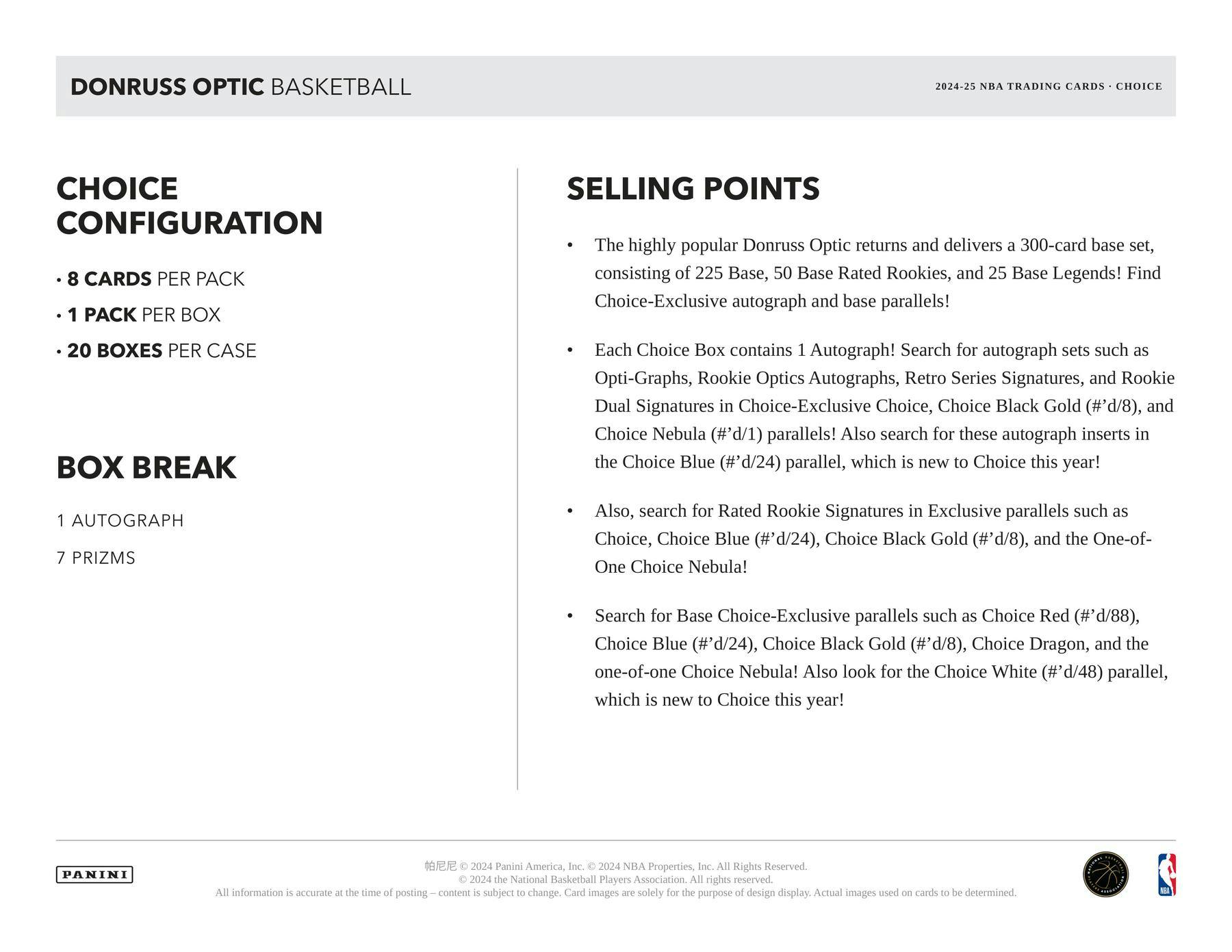 Search for Base Choice-Exclusive parallels such as Choice Red (#'d/88), Choice Blue (#'d/24), Choice Black Gold (#'d/8), Choice Dragon, and the one-of-one Choice Nebula! Also look for the Choice White (#'d/48) parallel, which is new to Choice this year!